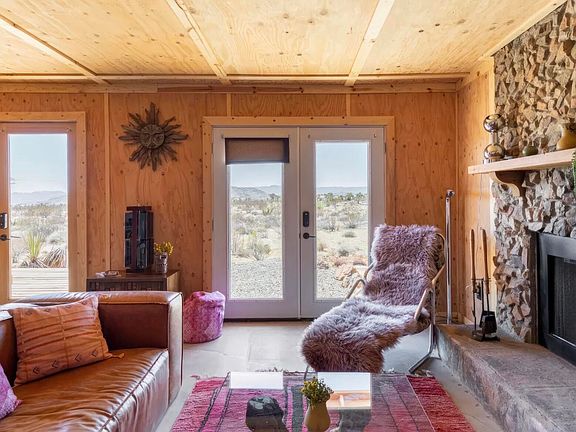 Turn key dream hideaway home on a magical 5+ sprawling acres set at the base of a chain of hills. 2 bed 1 bath and two detached storage sheds. Custom river rock fireplace with wood mantle and elevated stone hearth. Ornate wood ceiling and walls with decorative trim throughout. Finished concrete flooring. Spacious living room and dining area perfect for entertaining. Shelving alcove. Open kitchen with long butcher block counters complemented with stainless steel sink. Cabinets, refrigerator, dishwasher, stove, and oven. Secondary cabinets and countertops ideal for staging a buffet of food and drinks for parties. Mini Split AC/Heat system. Master bedroom with sweeping vistas. Bathroom with shower, tub, and vanity. Step on onto the expansive wraparound deck and feel the open desert with enchantment. Inspiring views of snow capped peaks on Mt San Gorgonio and Mt San Jacinto. Captivating shadowy cliffs on the rocky Mt Bartlett which juts up 700ft from its base. Sunsets where the Bullion Mtns often glow red in the last light of the day. Enjoy the starry nights in the 4 person spa. The home is perfectly situated in the center of the 5.15 acres with only a few neighbors. This luxury pocket of Yucca Valley boasts high priced sales comparable. Short drive to organic restaurants, cafes, bars, and the farmers market. Only 15 miles to Joshua Tree National Monument where in 2021 over 3 million tourists visited the park. 37 miles to Palm Springs. 130 miles to LA. Don't Wait! - Call Now