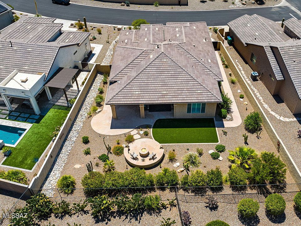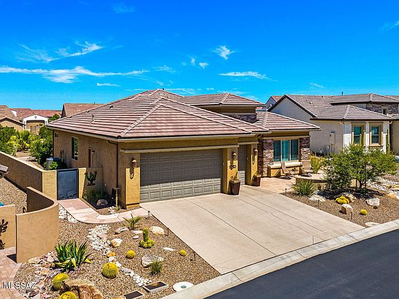 Upgraded Alora model on an expansive lot nearby SaddleBrooke Ranch's abundant amenities. Built in 2019, this property offers exceptional value with all initial major investments already completed. The property features 2 bedrooms plus a versatile den, 2.5 bathrooms, and an oversized 2.5-car garage with room for a golf cart or additional storage. The backyard is a highlight with a spacious covered patio equipped with automatic solar shades, built in fire-pit, and mature landscaping blankets the grounds. It's perfectly positioned lot captures brilliant evening sunsets on the patio. As you enter, the feeling is light and bright providing an open concept floor plan. You will find many upgrades, including an ensuite bathroom in the guest bedroom, an expanded primary bathroom, an enlarged primary walk-in closet & primary bedroom, upgraded shutters, custom entry glass door, and built in surround sound. The kitchen has a contemporary feel with its intricate designer backsplash, large quartz island, stainless steel appliances and a comfortable breakfast bar and dining nook.