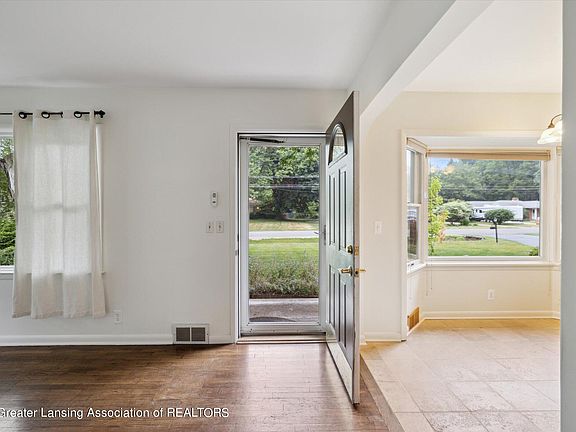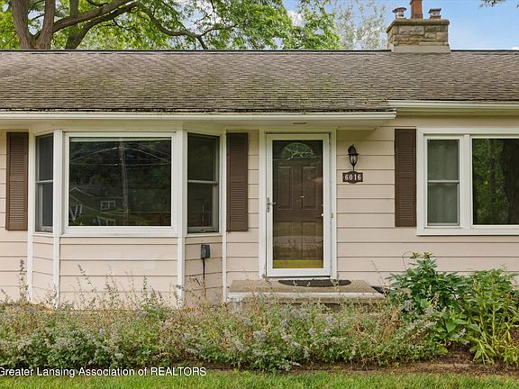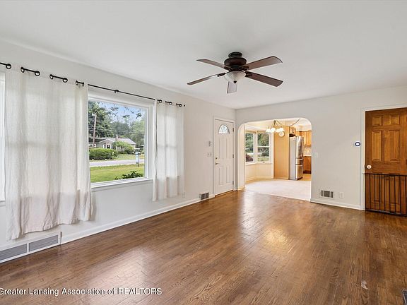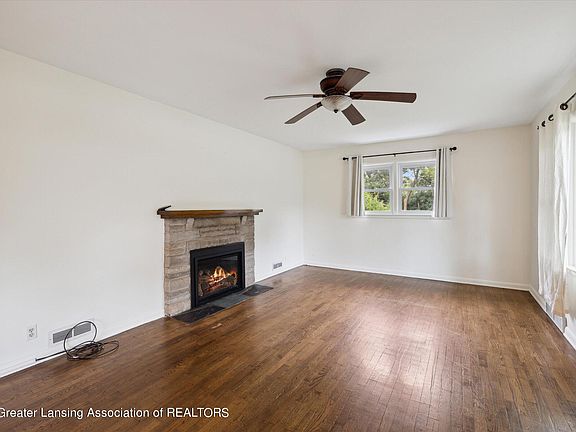 Discover this classic mid-century ranch home, nestled on over half an acre in the sought-after East Lansing school district with Meridian Township taxes! Freshly painted, with nearly 2000 sqft of living space, it features arched doorways, newer high efficiency gas fireplace insert, built-ins and a laundry chute. The main floor has hardwood floors throughout, a full bath and a powder room, a spacious kitchen with Corian counters and a tiled backsplash, maple cabinetry, and stainless steel appliances. The partially finished lower level includes a large rec room and a flex room - perfect for a game room or an office. A breezeway connects the 2-car garage to the home, and the new storm door leads out to a lush backyard with a deck, an expansive paver stone patio, a 6-foot tall, approximately 24' x 32' fenced garden area, and a custom wood shed with a treehouse roof. The property has mature hardwoods, perennial gardens and backs up to Albert A. White Memorial Park, which features a pond, trails and a sledding hill. This prime location offers both privacy and convenience to downtown East Lansing, the public library, MSU, and other local amenities just a short distance away.