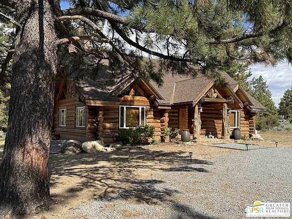 ALL OFFERS WILL BE CONSIDERED for this one-of-a-kind Log Home. It will be a special place for you to call home. Whether used for full-time residency or as a second home, the serenity of this open concept 4.5 acres, is sure to please the most discerning buyer. The Log Home includes a large entry foyer which sets the stage for all the interior spaces of this home. To the left of the entry is the large Great Room with wood burning fireplace, Dining area and Kitchen featuring a whimsical breakfast bar made entirely of a free form log - stunning! The two-story plus high ceilings and the use of the natural log walls lend themselves to the unique character of this special residence. The Great Room is light and bright just perfect for both intimate gatherings or large-scale parties. The views of the mountains in the distance are incredible. The kitchen features granite counters with custom designed backsplashes that depict the mountains - very clever - plus the new electric range/oven, pot-filler and vent hood, double door refrigerator, microwave oven, dishwasher and a semi-hidden pantry closet under the stairs to the loft complete the open kitchen. There is a free form log bar in the corner of the Great Room as well. To the right of the front door is access to the large Primary First Floor Suite with extremely high ceilings and a ceiling fan and access to the combination dressing room/spa room and then on to the primary ensuite bath. The stall shower has beautiful stone work. The double vanity, with granite counters, is great as well. The views from the bathroom and primary suite are exquisite, as they are from the other rooms in this well designed home. The dressing/spa room offers direct access to the north facing deck with room for outdoor entertaining and the outdoor spa, just a few steps away. At the other end of the home, the French doors off the Great Room lead to the first floor bedroom, which could also be used as an office or study. This room also offers access to the north facing deck. Besides the first floor bathroom - with the stackable laundry closet - up the stairs is the additional lofted bedroom - extremely light and bright featuring lovely views to the north. The property is well maintained with pastures for a myriad of uses and the electronically operated iron gate sets the stage for what awaits owners and visitors to this massive property. Located within a 45 minute drive to Palm Desert - El Paseo - shopping and dining and the property is about a 25 minute drive to Idyllwild/Pine Cove. The Paradise Valley Cafe, at the corner of Hwy 371 and Hwy 74 is a great dining location just a few miles to the east of the property. The community has it's own clubhouse known as the Garner Valley Property Owners Association also located on Devils Ladder Road. Easy to show. Welcome to your new Mountain Home!