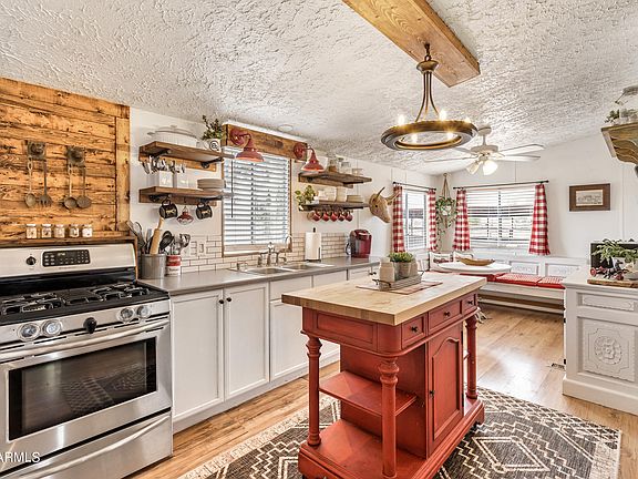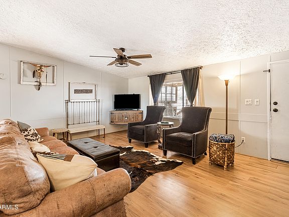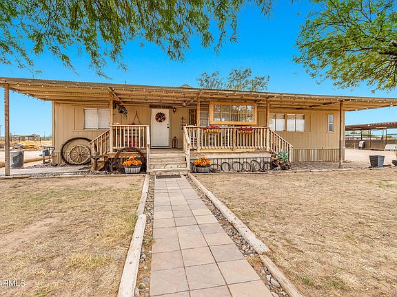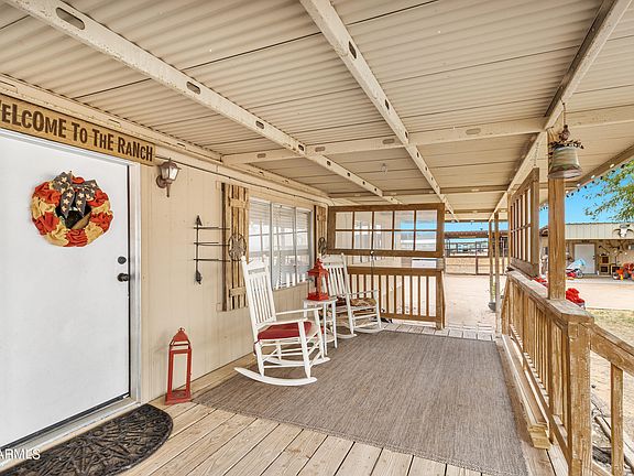 natural light. Kitchen has pantry, plenty of cabinet & counter space, island, and all appliances stay. 56' Round Pen, arena, and 3 pens in the corners. Buyer to verify property facts and figures. Quick 15-20 minute drive to Casa Grande or Maricopa for shopping. Come sit on your covered front porch and enjoy the mountain views!