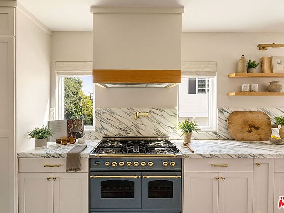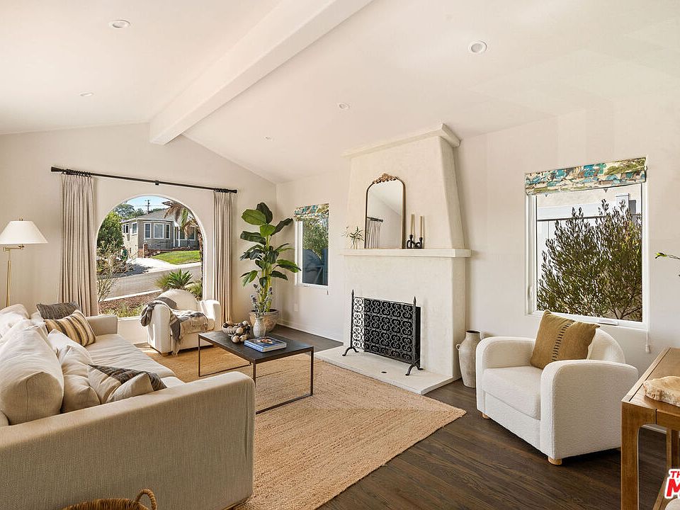 This Spanish-style Westchester residence was taken down to the studs and fully reimagined by a seasoned interior designer, completed in 2022 with impeccable attention to detail. Every space blends modern luxury with timeless character, from the wood-burning fireplace with a gas starter to custom ironwork railings and hardwood floors. The chef's kitchen is a showpiece, featuring custom wood cabinetry with Rejuvenation hardware, Arabescato marble counters, and top-tier European appliances including an ILVE 40" range, brass pot filler, and Fulgor Milano built-ins. The spa-like primary suite boasts a double vanity with Arabescato marble, a freestanding soaking tub, and an oversized shower with Kallista rain fixtures. Designer window treatments and curated finishes throughout underscore the home's elevated design. Outside, drought-tolerant landscaping, automatic lighting, and citrus and fruit trees create a private backyard retreat. A finished garage with 200v EV charging outlet completes this turnkey offering. Ideally located on a quiet, welcoming street, just minutes from Playa del Rey, Playa Vista, Silicon Beach, and LAX, this home delivers a rare blend of coastal convenience, Spanish character, and true designer pedigree.