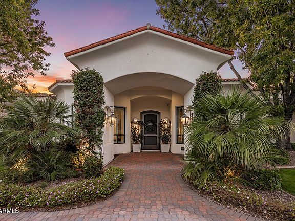 Nestled in a quiet cul-de-sac of only four homes, this charming Santa Barbara-style transitional residence offers timeless charm, tasteful updates, captivating views of Camelback Mountain and lushly landscaped grounds that are truly an oasis in the desert. The exceptional single level floorplan features 6,467 square feet in the main home with 4 ensuite bedrooms, 6 bathrooms, an office, a generous sitting room off of the primary bedroom, a fitness room, refrigerated wine room, and a 726 sq ft separate guest house. The privately gated driveway provides abundant room for parking in addition to the side-entry 4 car garage. A paver stone walkway leads the way to the home's inviting front entrance. Inside, a striking chandelier adorns the entry foyer, which overlooks the living room with a dramatic floor-to-ceiling chevron pattern stone tile fireplace, wood plank ceiling, and views of the lush backyard.