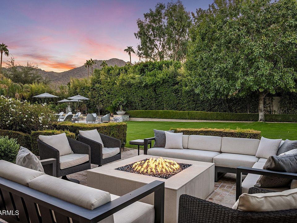 Outside, the backyard is an enchanted garden, with mature trees and abundant foliage set against the backdrop of Camelback Mountain. A brick walking path lined with rose bushes and lush hedges traverses the yard from one side to the other. An expansive grassy play area, approximately 90 feet long, offers endless possibilities for outdoor fun. An enormous resort-worthy pool area with multiple water features is positioned perfectly to take in the view of Camelback. A deep covered patio with Chicago brick pavers provides ample room for dining and lounging, and offers a built-in barbeque and pizza oven. Just off of the covered patio is a large gas firepit with plenty of room for guests to gather around on a cool desert evening.