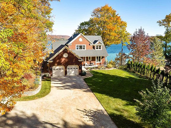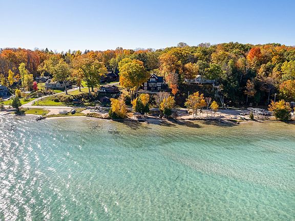 Experience the best of Crystal Lake living with this beautifully designed and updated waterfront home, nestled on nearly an acre with 100 feet of pristine, sandy, private lake frontage. Located on a peaceful stretch of the lake’s south shore, this property offers serenity and privacy yet it’s just a pleasant stroll or bike ride down the Betsie Valley Trail leading you to the charming Village of Beulah. A short drive or bike ride to the City of Frankfort and access to stunning Lake Michigan beaches. Step inside to discover three levels of panoramic lake views from this 5-bedroom, 3-bath home. The upper-level master suite is a true retreat, featuring a soaking tub, walk-in closet, and private deck. The light-filled main floor boasts vaulted ceilings, cherry-wood floors, and expansive lake-view windows that open onto raised decks with glass rails, ensuring unobstructed views of the sparkling water. A gas fireplace anchors the inviting living area, while kitchen delights with sustainable cork flooring, stainless appliances, custom cabinetry, a generous island, and a walk-in pantry. The newly updated finished lower level offers space for relaxation and entertaining, complete with a wet bar with hickory cabinetry, two bedrooms, a full bath and a walkout patio overlooking the lake. Outdoors, the property is professionally landscaped and irrigated, featuring two patios, a firepit, and your very own Tiki Hut complete with 240 electrical service, internet, wireless TV and speaker system creating the ultimate lakeside entertaining space. Many electrical improvements include a whole house generator, patio and deck spaces all zoned for speaker systems and home communication system is centrally wired. With nearby golf courses, ski resorts, and bike trails promise year-round recreation. Whether you’re seeking a year-round residence or a four-season retreat, this Crystal Lake gem captures the essence of Northern Michigan lakefront living—elegant, comfortable, and perfectly located.
