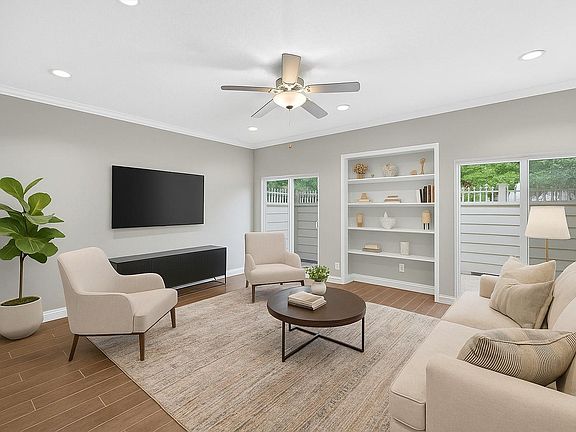 Experience refined living in this beautifully updated residence just minutes from the Galleria. Every detail reflects comfort and quality, from hurricane-grade windows and sliding glass doors to 2019 upgrades including roof, HVAC, plumbing, and electrical systems. The stunning central atrium brings natural light and serenity, featuring new wood decking and an oscillating ceiling fan for year-round enjoyment. The kitchen impresses with stainless steel appliances, granite-look surfaces, and a sleek dry bar perfect for entertaining. Upstairs, the spacious primary suite offers an elegant ensuite bath and walk-in closet, while the secondary bedroom provides equal comfort for guests or family. Some photos may be virtually staged; décor added digitally, permanent features unchanged. Nestled in a gated community with a sparkling pool and mature trees, this home combines privacy, style, and convenience in one perfect Galleria-area retreat.