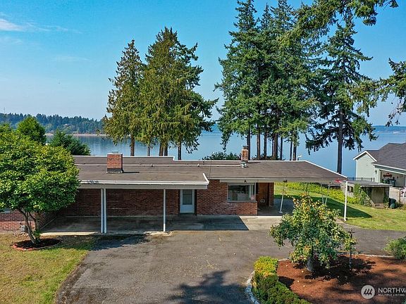 Breathtaking west-facing water & mountain views surround this charming rambler, on a fully fenced, nearly one acre lot. Gated entry with circular drive, 2 bedrooms, 1.5 baths, and 1,372 sq. ft. of comfortable living space. Features include a cozy wood-burning fireplace, built-in bookcase with hidden compartment, and a quaint kitchen with dining nook. The spacious living room opens to a patio through a large sliding glass door showcasing stunning views. Detached powered building, two carports, and heat pump with A/C complete this inviting property.