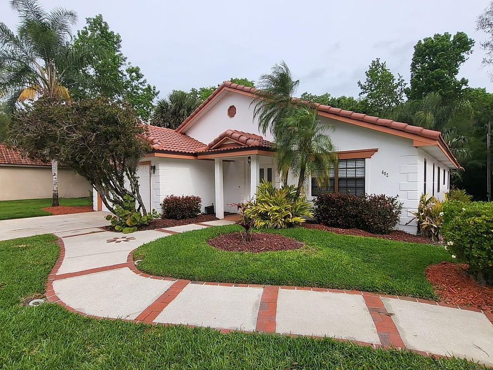 Beautiful Mediterranean style home in highly desirable Highlands neighborhood. Very unique, indoor rain pass through atrium with tropical garden. Exotic Pergola for coffee in the morning by tropical foliage surrounded lagoon. Master suite with attached master bathroom with Roman tub and separate walk-in shower & his and her sink vanity's. Two guest bedrooms, one guest bathroom. Additional air condition room in garage with its own private entrance that could be used as a 4th bedroom or office. Newley renovated kitchen. Beautiful community clubhouse with swimming pool. Also tennis pavilion with 4 tennis courts and women's and men's bathrooms and covered sitting tables. Excellent choices and learning charter school nearby.