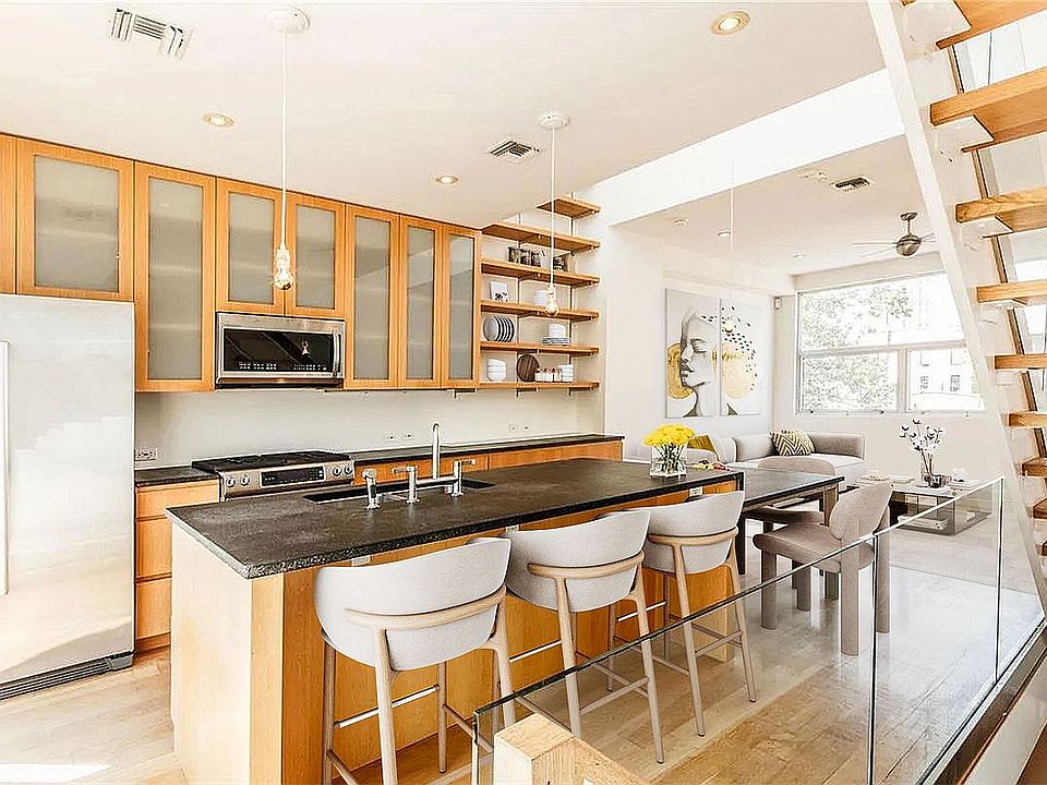 The upper triplex lives like a house in the sky. Its top-floor living area is open, airy, and wide, featuring exposed brick, hardwood floors, and a striking floating stair with a glass handrail. A full wall of windows floods the space with south-facing light, while sliding glass doors on the opposite side open to a decked outdoor terrace designed for grilling, dining, and easy entertaining. The open kitchen includes a granite-topped breakfast bar island and custom dining table, pendant lighting, ample counter space, and a full stainless-steel appliance suite, including a French-door refrigerator. Built in shelving stretches from the living room wall all the way up to the mezzanine floor above.
