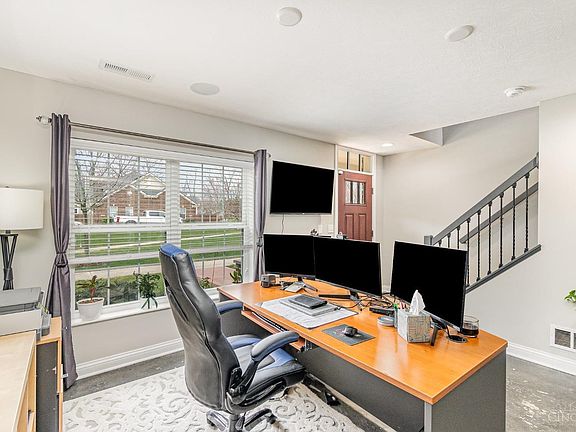 Check out this new listing in highly sought after Parkside Row Springboro! This 3 story brick condo w/open, lofty, industrial vibes, has the perks w/out the price tag. 1st flr offers covered front entry, entry from rear 2 car garage, flex room w/full bth & large closet. Perfect for office, sitting area, or convert to 3rd bdrm. Main flr offers gorgeous hardwd flrs, fully equipped Kitchen, walk-in pantry, SS appls, large island, granite, open dining & living rm w/beautiful brick wall & 9 ft exposed ceiling. Walk-out to spacious private balcony overlooking green space, perfect for watching sunrise, enjoying stars or for grilling/entertaining. Your choice! Upstairs ft. convenient laundry closet. Spacious primary w/trey ceiling, en-suite w/double vanity sink, large walk-in shower/closet. 2nd bdrm has private bth & walk-in closet. HOA covers water, trash, all exterior maintenance, snow removal, landscaping. Minutes to Austin Landing/Shopping/Restaurants, highway makes it perfect location!