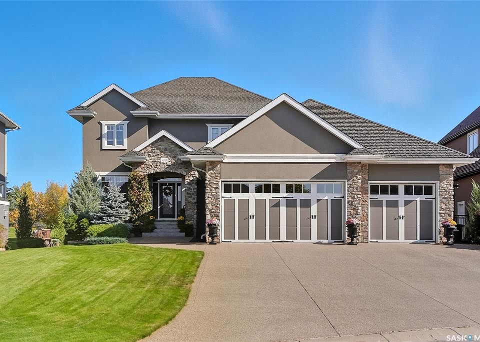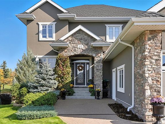 Welcome to 69-602 Cartwright Street – Luxury Living in The Willows Experience refined elegance in this immaculate 2,539 sq ft walkout two-storey, ideally located in Saskatoon’s premier golf community, The Willows. Backing the lush fairways, this professionally landscaped home offers exceptional design, upscale finishes, and seamless indoor-outdoor living. Step into a grand tiled foyer with French doors leading to a stylish main-floor office/den. The open-concept living area is warm and inviting, with gleaming hardwood floors, recessed lighting, and built-in surround sound. A stunning gas fireplace with stone surround and wood mantle anchors the living room, creating a cozy yet sophisticated atmosphere. The chef-inspired kitchen showcases custom maple cabinetry, quartz countertops, a large island with raised eating bar, built-in wine rack, pot filler, and a premium 48” Jenn-Air gas range with industrial-grade exterior-vented hood. Under-cabinet lighting, a tiled backsplash, and corner pantry complete the space. The dining area opens to an east-facing deck with built-in speakers, gas BBQ hook-up, and sweeping golf course views. Upstairs, retreat to a luxurious primary suite with French door entry, spa-like ensuite featuring dual vanities, makeup station, tiled steam shower, and walk-in closet. Two additional bedrooms, a 4-piece bath, and a well-appointed laundry room with cabinetry and sink complete this level. The fully developed walkout basement includes a spacious family room with wet bar, 4th bedroom, 3-piece bath, and a flex room/den. Step out to a covered patio with exposed aggregate, speakers, firepit, hot tub (new cover 2025), pergola, and beautifully landscaped yard with shed and underground sprinklers. Additional features: 9’ ceilings, solid 8’ doors, upgraded trim, Control4 system, heated triple garage, zone heating, hot water heater (2025), central air/vac, and in-floor heat in bathrooms. Luxury, comfort, and location—this home has it all.