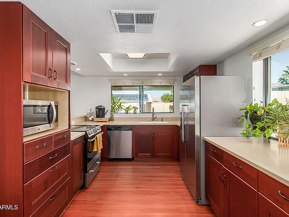 Welcome home! This delightful corner lot property greets you with a practical carport, a lovely brick facade, and a landscaped yard with natural turf and mature trees for natural shade. Inside, you'll find a living room with a soothing palette, blinds, and durable tile flooring. The family/dining room includes a fireplace for cozy moments. The kitchen comes with solid surface counters, ample wood cabinetry, recessed lighting, stainless steel appliances, and a pass-through with a breakfast bar. The main bedroom has soft carpeting, double built-in closets with mirrored doors, sliding door access to the backyard, and a private bathroom. The enchanting backyard features a covered patio, a manicured lawn, and a gazebo with an outdoor fireplace for evenings under the stars. Make it yours today!