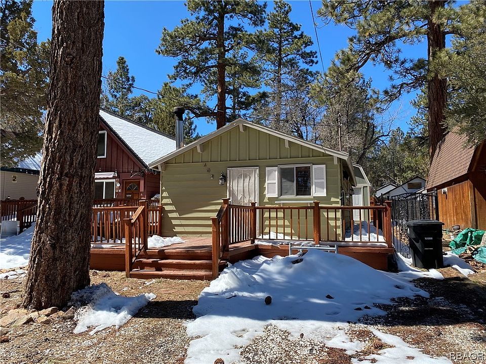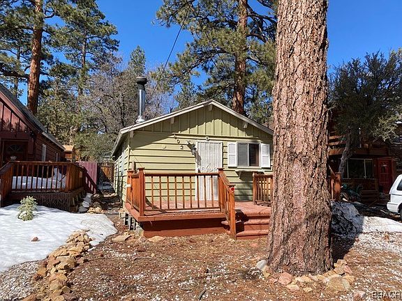 Popular chalet-style cabin, comfortable single level in upper Sugarloaf near national forest. Wood beamed ceilings and durable wood laminate style flooring. Efficient Franklin stove in the living room. Kitchen has custom cabinetry offering plenty of storage plus a breakfast bar. Fresh interior paint and bedrooms have new carpet. Windows feature wood plantation shutters. Laundry hookups for a stacker washer/dryer. Huge quality storage shed in the fenced back yard plus a concrete slab for patio or spa. This property was purchased by current owner at foreclosure post auction bid pursuant to SB 1079. SB 1079 was put in place to promote homeownership and therefore priority for offers are given to owner occupant buyers.