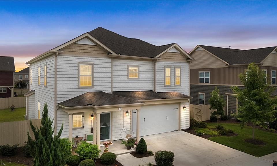 Make this your first stop! VA assumable loan at 3.125% Located in the highly sought after Hickory School district, the Bentley model is a favorite w/an open floor plan and tons of natural light. An amazing chef's kitchen features quartz counters, an abundance of storage both in cabinets and drawers. The bar is large and fantastic for entertaining.The great room, dining area, and kitchen all have a view of the fireplace as well as the generous outdoor patio. Upstairs the primary suite is a wonderful retreat with a spa like bathroom featuring a walk in shower, garden tub, and dual sinks. Huge primary closet with tons of storage space. All bedrooms are amply sized and have ceiling fans. The backyard is fenced with large patio. Amenities include lawn maintenance, water/sewer, pool, clubhouse, gym and playground. All ponds are stocked with fish. Centrally located near interstate, naval bases and Chesapeake Commissary