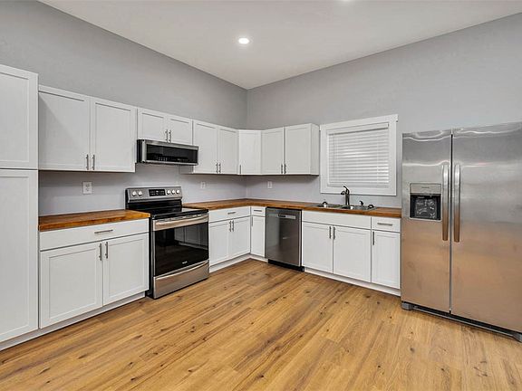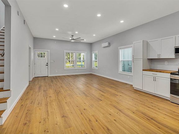 The spacious front porch welcomes you inside, where the light-filled living area flows seamlessly into a well-appointed kitchen with butcher block countertops, ample cabinetry, and a smart layout for easy meal prep. Each of the three bedrooms includes its own private en-suite bathroom—perfect for guests, roommates, or rental flexibility.