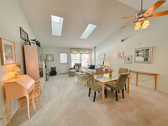 BETTER THAN NEW! SPAC.RANCH IN LOVELY 55+COMMUNITY W/PRIVATE BACKYARD GREAT LOC. SHOWS PERFECT INSIDE & OUT! Enjoy the convenience of a one-level living active 55+ adult community. This ranch style home features a spacious open floor plan and is move-in ready! Cathedral ceiling with V-Lux skylights in the living room and dining room flooding with natural light. Opens to the kitchen updated with stainless steel appliances and tile backsplash. All appliances staying with home including the washer and dryer and window treatments. New Kitchen wood floor just installed a year ago, along with a new air condition unit. White 3-panel doors and trim throughout. The extra wide attached two car garage offers plenty of space for storage and easy parking for guests. Backyard patio. No outside work to be done! The association covers exterior maintenance, lawn care and snow removal. Close distance to major roadways and to local parks and forest preserve. Great location near shopping, restaurants and entertainment.