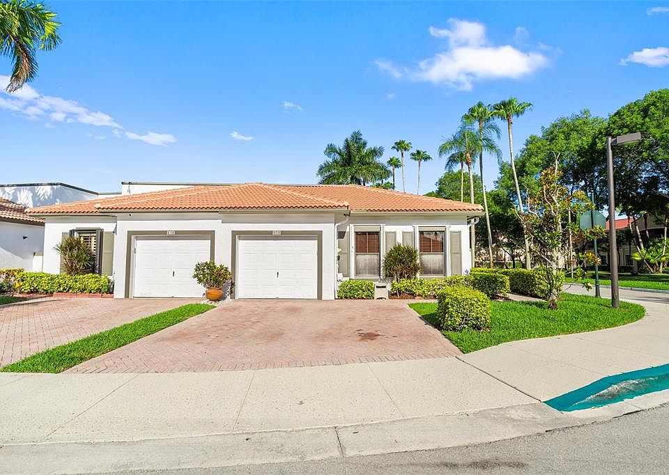 Discover this stunning Corner Villa with 3-bedroom, 2-bathroom and attached 1 car garage home in the gated and guarded Grand Palms Golf Community, minutes from I-75. This single-story features a freshly painted open, split floor plan with laminate and tiled flooring. Enjoy a remodeled master suite and bathrooms. The large private paved courtyard adds a single-family home feel. Close to the community pool with beautiful golf course views. Recent updates include a two-year-old roof and a one-year-old water heater. Equipped with accordion hurricane shutters and alarm monitoring, all covered by a low HOA fee. Near Pembroke Gardens and Pembroke Lakes Mall for shopping, dining, and entertainment. A must-see for its charm and value!