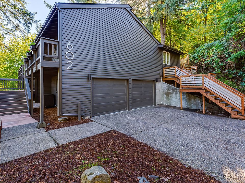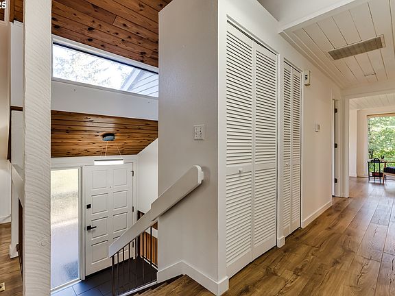 Enjoy the natural beauty and peaceful surroundings in this attractive home! The home has a gorgeous open beam ceiling, wide plank floors, wood paneled accents throughout and expansive windows that bring the outdoors in! The living room is vaulted with two large sliders to the front balcony. The kitchen has updated appliances, marble tile counters and generous dining bar. The sitting room is vaulted with skylights and access to the large deck, making it perfect for entertaining. The primary suite has a fireplace, slider to the balcony, an attached vanity area, private bath, walk-in closet with organizer and access to back deck & hot tub. The main level bathroom has been updated. Downstairs has a theater room with fireplace and built-in 85" mounted TV. An additional bedroom, third full bath and utility room complete the downstairs. The garage has a work bench, epoxy floor & updated garage doors. This home has been well maintained with new paint, gutters, all new lighting fixtures, updated trim, newer roof, new heat pump, high efficiency hot water heater, new composite decks, fencing & hot tub! Located in a desirable neighborhood close to Spencer's Butte, hiking trails and in the South Eugene School District.