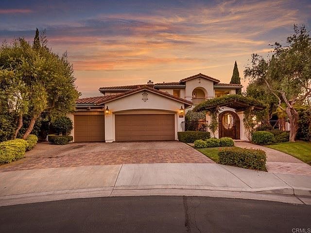 A TRUE GEM! THE JEWEL OF SANDALWOOD!! ABSOLUTELY BREATHTAKING COASTAL VIEW PROPERTY SITTING ON AN OVER-SIZED PRIVATE LOT. Sweeping 270 degree panoramic ocean views from the entire home offering some of the best views in Encinitas. This home offers arguably the best lot in the neighborhood nestled on a small quiet cul-de-sac behind gates in the prestigious neighborhood of Sandalwood. This residence offers stunning court yard entry with custom wood gates and fountain and lush mature landscaping throughout. Upgraded kitchen and open floor plan to take advantage of the views from the ground level. Full bed and bath on ground floor, large French doors lead to an expansive yard offering an sprawling loggia and outdoor pavilion ready for entertaining, fully equipped with restaurant style bar that was hand crafted from stone with seating for 6 angled perfectly to take in the jaw dropping sunsets! New professional equipment including; 2 wine fridges, ice maker, beer taps, burners, heater and custom glass door double sided wood burning/gas fireplace. On the other side of the yard you have a 4 hole 500 sqft golf green sand trap included! Plenty of space to add a pool/spa or anything you would want. Upstairs you will find a luxurious master suite with sliding doors out to balcony to sit and watch the sunsets, large master bath and walk in closet. Three additional guest rooms on the other side of house two with balcony access. This home is the one you have been waiting for! Encinitas Schools, Large Private Lot, Amazing Views!! Low Mello Roos and HOA!