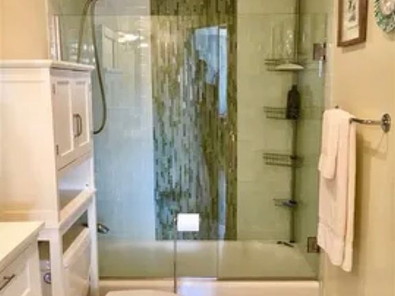 Completely refurnished bathroom, decorated with imported glass tile.