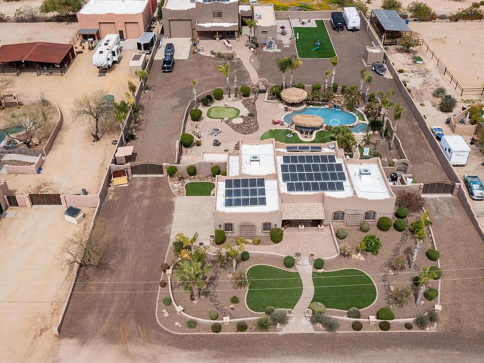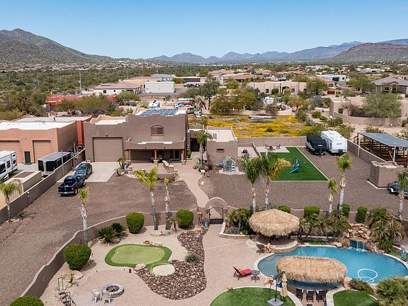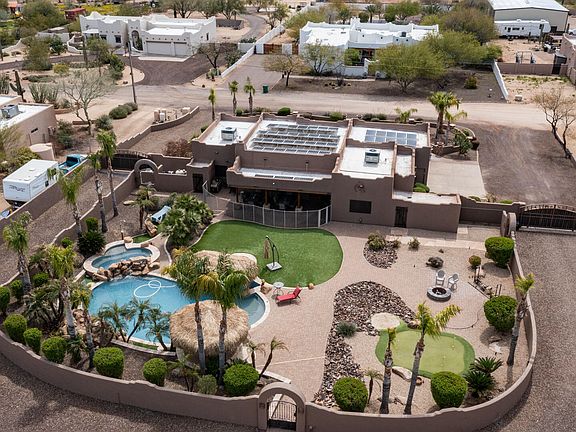 3 Homes on the Property Main home single level 4/2 with updated kitchen stainless Samsung appliances, convection oven with farmhouse sink granite countertops, travertine flooring and wood beam ceilings with 2 car garage. Guest Casita in back single level 1 bed 1 bath very nicely upgraded with plank tile flooring and updated granite counters with great room. Guest House is 3 bed 2 bath 2 story with loft very upgraded flooring and granite counters with electric fireplace RV Garage in back of home 36 x 24 with 14'' Door and 25' Ceiling. 11k house whole water system for entire property. 2 Septic tanks. Beautiful custom oversized pool with swim up bar and putting green. 2 16'Electric RV Gates on side yard for easy access. Air Fiber internet.