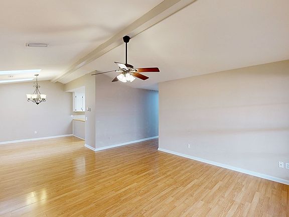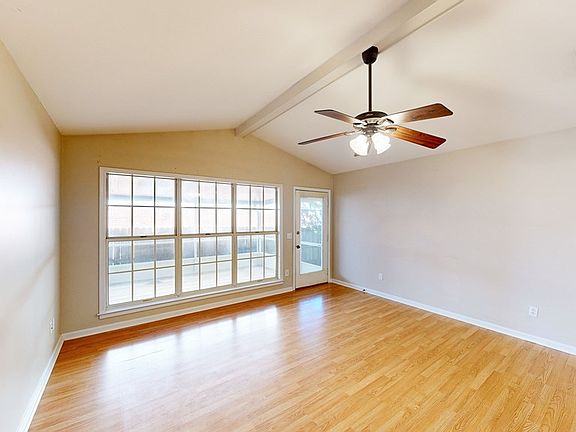 Call today to see this 3 Bedroom, 2 Bath home in Chapelwood, priced under $200,000. The floor plan is semi-open, providing nice separation between the kitchen and living room. The kitchen provides plenty of workspace and cabinetry, with an accenting wood-block countertop. At the back of the kitchen, one door accesses a pantry for needed storage, while the other leads into the attached garage. The dining area is open to the kitchen, where a chandelier hangs between two skylights from a vaulted ceiling that continues into the living room. The side wall of the living room is lined with windows and a glass exterior door that leads out to a screened porch and the fenced backyard. The floor plan is split, with the primary bedroom in one corner of the home, featuring an ensuite bath and a walk-in closet. The only carpet in this home is found in the primary bedroom closet. At the back of the home, the two spare bedrooms are separated by a 2nd full bath, and a laundry room with front-loading washer and dryer that remain with the home.