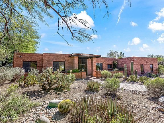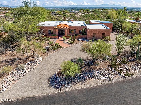One-of-a-kind Foothills lot with views from every window. New roof! Stunning estate with the views every Tucsonan wants. Mature landscaping and territorial brick design, you won't find another like it. Beamed cathedral ceilings in the main living area give it that warmth and charm. Light and bright island kitchen with quintessential tile counters and over-sized skylight dome. Solid wood interior doors. City views twinkle right from your bedroom window, overlooking the easy-care pool and spa. Built-in grill facing Mt Wrightson. Guest house is steps away, providing 2 bedrooms with a full bathroom, living room and wet bar. High ceilings and plenty of storage are just two of the perks of the guest house. Ice machine in the kitchen! Gas cooktop and wood-adorned hood. Cutting boards are in pristine condition. House shows truly like a gem! 3-car garage with lots of storage. No neighbors across the street. Den could be easily converted into 3rd bedroom by simply adding french doors. Formal dining space plus breakfast far and eat-in kitchen. This home is in impeccable condition, bringing the nostalgia forward to the present to be appreciated. The tilework and like-new cutting boards are so true to the era. Buyer to verify all facts and figures, including those in MLS.