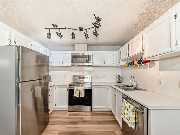 Corner gas fireplacePrivate fenced backyardSleek white cabinetryStainless-steel appliancesAdjacent dining nookLaminate flooringLarge master retreat