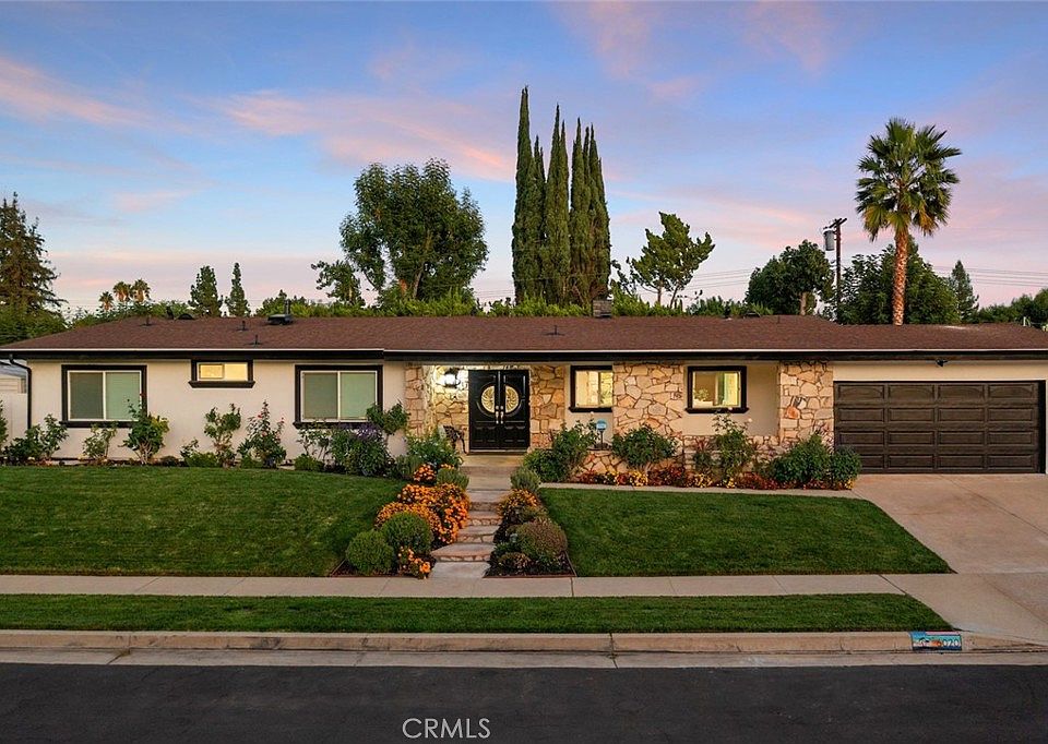 Meticulous mid-century modern Charles Du Bois single level home with rare attached 2 bedroom, 1 bath guest unit with full kitchen - ideal for rental income, extended family, or home office/studio space. The property sits elevated above the street on a sprawling 11k lot boasting almost 100 feet of frontage adorned with manicured front lawns and lush landscaping. An ascending stone pathway leads to the covered front porch cladded with an original stone exterior. Step through double doors into the entry foyer that opens to expansive separate living & dining rooms each with tongue & groove wood beamed vaulted ceilings, original stone fireplaces, and two sets of glass sliders that open to the backyard for the perfect indoor/outdoor flow. The oversized remodeled kitchen boasts large island with breakfast bar seating, quartz counters with soft close cabinetry, wine fridge, and a suite of Forno stainless appliances including 60” fridge & freezer and large range with double ovens and 8-burner stove with pot filler and tiled backsplash. The left wing of the house has 3 bedrooms and 2 full bathrooms. The spacious primary suite features high vaulted ceiling, glass slider that opens to the yard, large walk-in closet, separate makeup vanity, and en-suite upgraded bathroom with dual sinks, spa tub, and separate walk-in shower. Two additional secondary bedrooms share a bathroom. The attached guest unit has its own exterior access and is also accessible from the main home through a separate wing. The guest unit features two bedrooms, a private bathroom with dual sinks and walk-in shower, and a full kitchen with stainless appliances. This space is approx. 643 SF and is included in the total SF and bedroom/bathroom count. The entertainer’s backyard has a sweeping covered patio perfect for outdoor dining and lounging, lush grass lawn with mature trees, and large side yard with storage shed. The guest unit has its own private fenced-in yard hidden from the main property with patio, grass lawn, and additional storage shed. Adjacent to dining/shopping at the Westfield Mall/Village, Calabasas Commons, local parks/hiking, & zoned for award-winning El Camino & Hale charter schools.