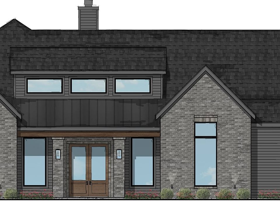 Architectural details include board & batten siding, natural brick accents, and charming gable rooflines. The covered