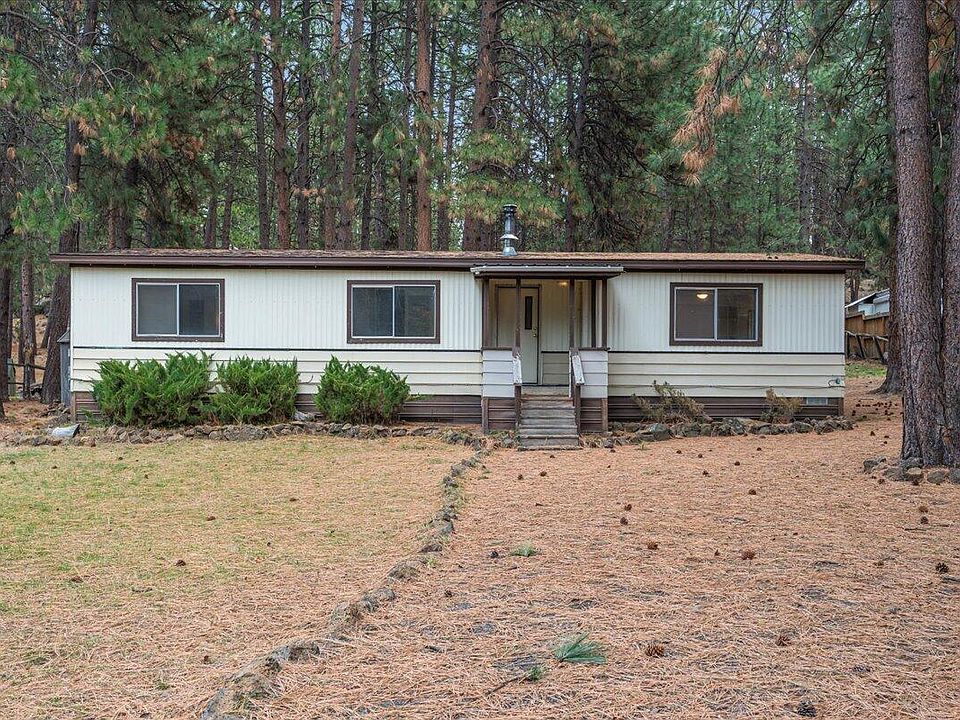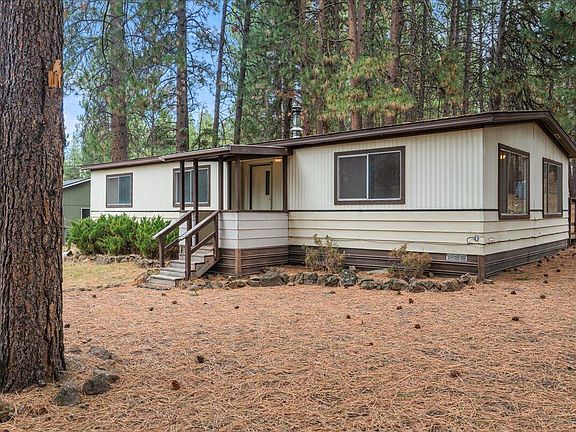Discover one of the BEST DEALS in all of Bend! Tucked away in Deschutes Riverwoods on a one-of-a-kind, 1-acre lot with dramatic rock outcroppings rising in the backyard and a peaceful, wooded Ponderosa pine setting that feels worlds away—yet you're still close to town on a quiet paved road. This clean 2-bedroom, 2-bath manufactured home features fresh new carpet throughout, a cozy wood-burning fireplace, a bright open living space, and a spacious back deck perfect for taking in the view of your private landscape. Fully fenced for privacy and pets, plus two handy storage sheds. Horses/livestock allowed, no HOA, room for RV/toy parking, room to expand, or simply enjoy Central Oregon living at its most affordable.