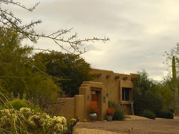 Amazing Santa Fe style custom home. This home is a gem in the desert with all the southwest features. Entering into the captivating front courtyard sets the tone of this impressive home. With a comfortable livable floor plan featuring living & family room and master suite split from other three bedrooms. The family room off the kitchen boasts a fireplace, large picture windows with views of the natural desert setting and huge saguaro cactus that surround the property. The chef's kitchen open to the living areas with built in stainless steel appliances, breakfast bar, and cozy breakfast room add to the charm of this home. Entertaining is a delight that flows from the inside to the captivating lush backyard featuring a covered patio space, charming pool with boulder waterfall, lush mature