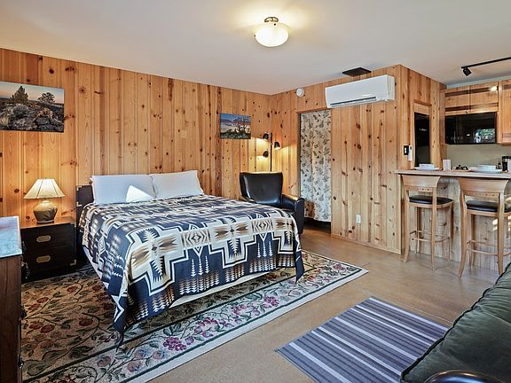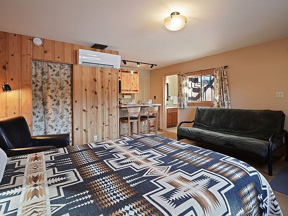 This fully furnished studio includes a queen bed and a futon sleeper, offering flexible living and guest accommodations. A mini-split air conditioning unit ensures year-round comfort. The bathroom is neatly appointed with a single vanity and enclosed shower stall.