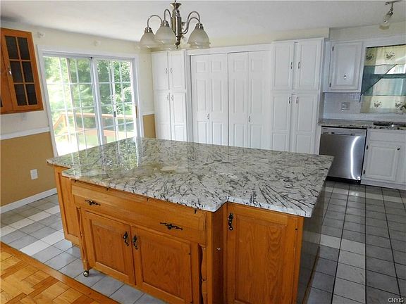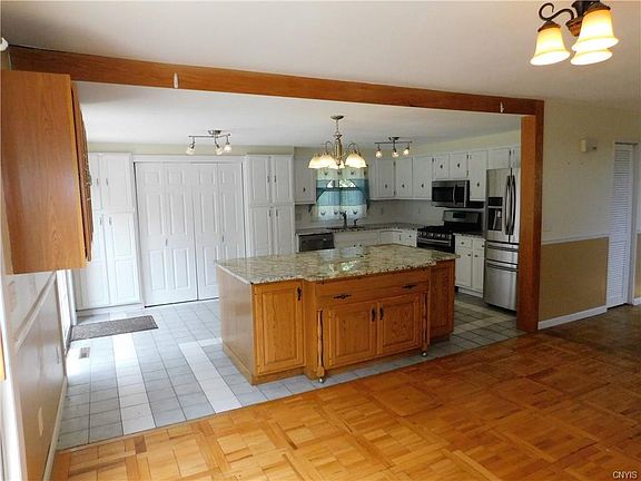 This home has 5 bedrooms and 2 full baths on the upper level and a 1/2 bath on the lower level. The garage has been converted to a main floor family room with a pellet stove. Large open kitchen with new appliances and a HUGE granite slab island. Formal dining room and living room. Master bath bedroom with master bath. Hardwood flooring. Almost 2400 sq feet of living space on over an acre. Sliders from the kitchen, dining room and off of the family room to access the large backyard. Oversized shed.