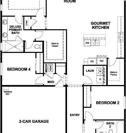 Generous open great roomBroad kitchen islandGourmet kitchenLaundry roomCovered patioDining roomBuilt-in pantry