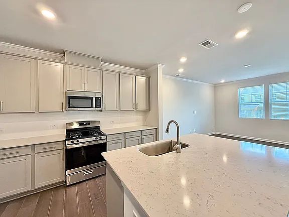 *Gourmet Kitchen: Equipped with GE stainless steel appliances, quartz countertops, a center island, and ample cabinet space, the kitchen is perfect for cooking and entertaining.