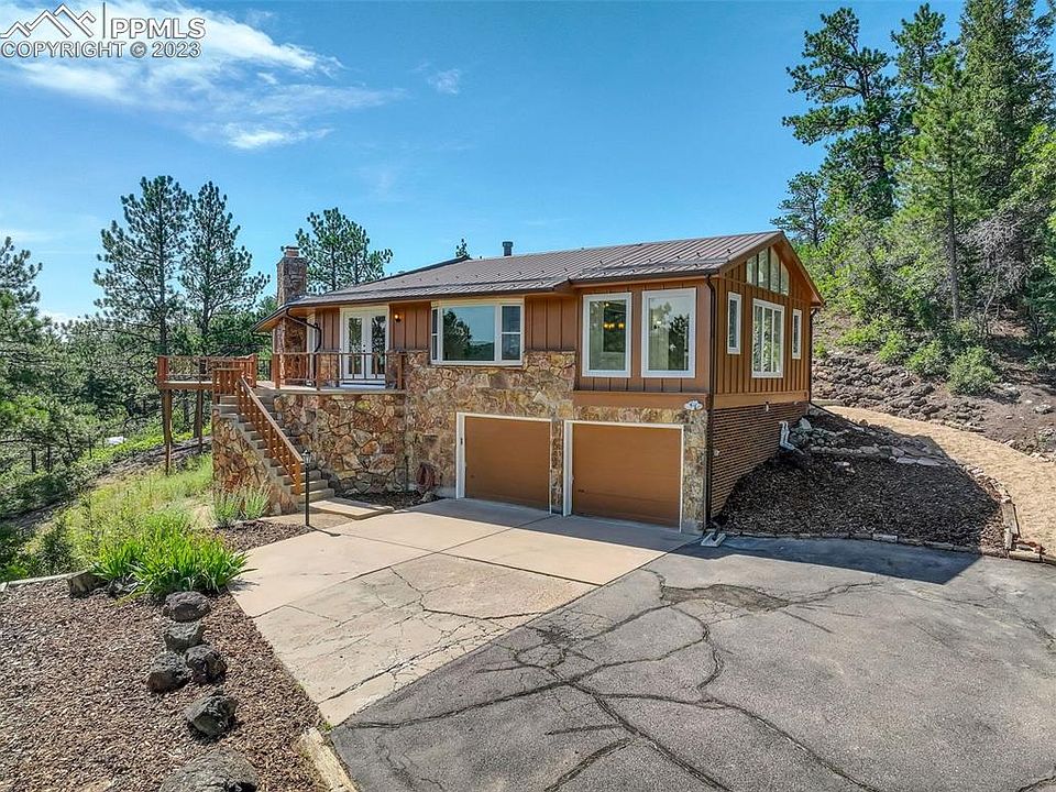 Must be seen in person to appreciate the home & the VIEWS! This Perry Park raised rancher seamlessly integrates rustic charm & modern, updated amenities! Come see for yourself & decide whether to spend your time indoors (admiring the red-rock VIEWS) or outdoors (star-gazing in this dark-sky community, golfing, or hiking the Pike National Forest trails). This warm & bright home has beamed tongue & groove ceilings on both levels, gleaming hardwood floors throughout most of the main level & features…living room w/bay window…formal dining w/passthrough from kitchen...sunroom w/French doors, vaulted ceiling & access to the new 21’x61’ private, serene back patio…completely remodeled kitchen w/Brooks Brothers cabinetry, quartz countertops, KitchenAid appliances & Zephyr hood, single bowl SS sink & glass door cabinets....breakfast nook that opens on to the patio…family room w/wood-burning moss rook FP, built-in bookshelves, & French doors to the expansive deck…16’x27’ primary bedroom w/new carpet, gas FP, two closets, built-in shelving & completely remodeled ensuite bath w/double sinks, Brooks Brothers vanity & linen cabinet & large shower w/seat…2nd bedroom w/new carpet overlooks private backyard...charming, refreshed full hall bath w/double sinks. The custom wrought iron railing leads to the cozy lower level w/stained concrete floors & the 13’x22’ family room with wood-burning FP with full-wall brick seating hearth & surround sound prewire (projector, screen, 4 speakers incl.)...2 large add'l bedrooms, both w/casement egress windows…perfect 10’x13’ work-from-home office w/high-speed internet, built-in desks & storage cabinets…14’x27’ game room/man cave/gym/home school room…fully remodeled, 3/4 hall bath…& 13’x15’ laundry/pantry/mudroom off the garage with incl. W/D, SS utility sink & 220V outlet. Outside, you’ll enjoy the oversized, insulated garage…ample parking…South-facing dog run or garden area, & no HOA! Only 30 minutes’ commute from the DTC, AFA & the Springs, too!