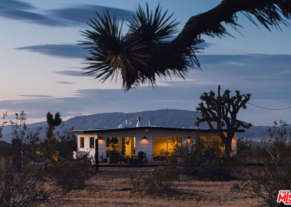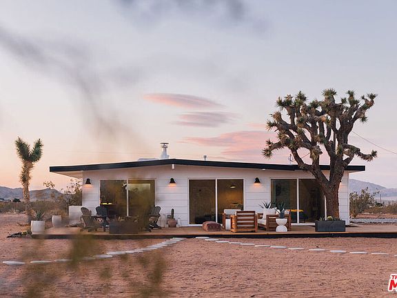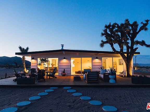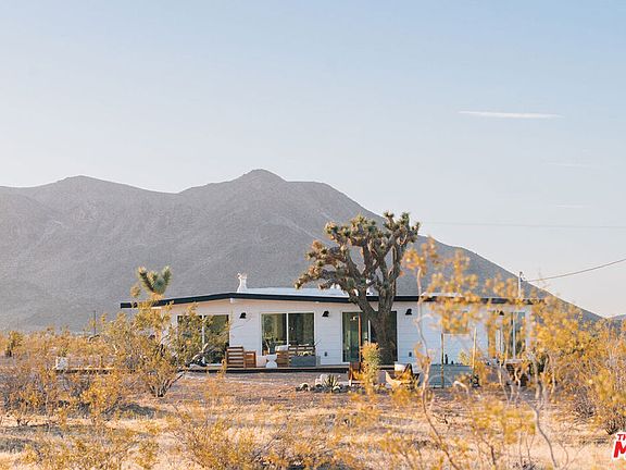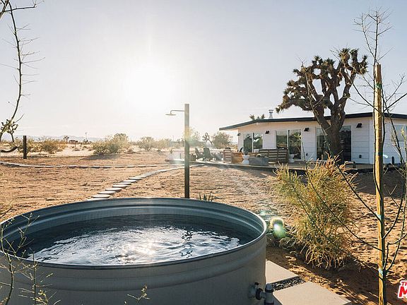 A unique, beautifully reimagined two bedroom & two bath Mid Century Modern home by the design team Kalm with privacy & views on 5 acres. Modern interior spaces w/ polished concrete floors & whitewashed walls. Striking views of snow covered mountain ranges, nearby Goat Mountain & the desert beyond from expansive picture windows. Bespoke kitchen w/ an abundance of white quartz counter space, cabinet drawers & new appliances. Great room with new working wood stove & tile backing. New systems throughout including electrical panel & replacement of all windows/doors for Low E, certified concrete septic, newly foamed and sealed roof and ducted HVAC. Large primary bedroom with expansive glass opening to an entertainment sized deck, ensuite bath with chic concrete Cle tiled bathroom. The second bedroom also opens to the great outdoors, has a changing area with built-in clothes storage & is served by a large family bath. Great room opens to an expansive entertainment deck, a filtered cowboy stock tank pool & hammock chill zone. New electrical panel with power supplied by SCE, city water and a certified septic make this property ready to enjoy. Dine nearby at internationally known La Copine, visit Giant Rock, Sound Bath - Integratron, Joshua Tree & Pioneertown. Landers is a hip hideaway for creatives & privacy seekers. Only 20 minutes to Joshua Tree and Pappy and Harriets; 55 minutes to Palm Springs & 2 hours to DTLA. A magical property. Permitted as a single family residence (SFR) which has been newly remodeled & never used as a vacation rental. Make this your wondrous desert escape, full-time residence or AirBnB.