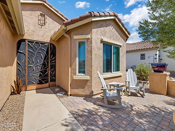 2012 Mateo with Private Yard & Nature Behind! Paver Courtyard & Custom Entry Door. Open Concept Living! Great Room has custom Built-in Media Wall. Dining Area has Slider to Patio. Kitchen has Granite Counters, Black Appliances, Gas Range, Cabinets with Tile Backsplash, Island, & Under Sink R/O System. Owner's Suite has Bay Window & Patio Door. Owner's Bathroom has Walk-in Shower & Closet. Guest Bedroom has Bay Window & Walk-in Closet. Guest Bathroom nearby. Laundry Room has W/D, Sink & Cabinets. Kinetico Whole House Water System & 3 Solar Tubes. Engineered Wood Flooring & Tile in Laundry Room & Bathrooms. Extended 2.5 Car Garage has Cabinets & Work Bench. Covered Patio with Gas Fireplace. Pergola & Extended Paver Patio. Gated Yard has Lovely Landscaping & Tortolita Sunset Views to enjoy!