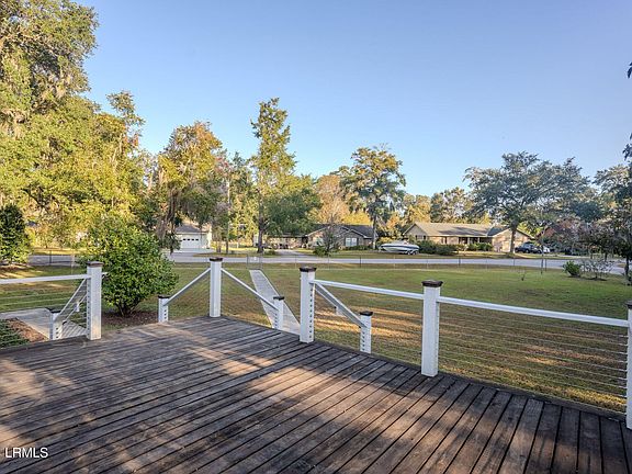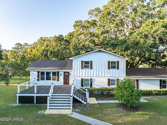 This beautifully renovated home is nestled on one of the most beautiful 0.91 acre homesites imaginable, adorned with Live Oak trees & a lovely assortment of lemon, persimmon, pear, fig & pecan trees. This home features new Hardi board siding, new windows, a new roof, a new fence across the back, new insulation & adding to the curb appeal is the newly added 326 square foot front deck. Inside, the original oak wood flooring has been restored, new luxury vinyl plank flooring added throughout the other living areas & new tile flooring added to the completely renovated kitchen & baths. Downstairs, there is a newly added master suite & separate den. In addition to the 2,100 square feet of living space, the heated & cooled Carolina room adds an additional 384 square feet of year round enjoyment. This home offers 2 living spaces, a large eat-in kitchen, 4 bedrooms, 2 1/2 bathrooms, plus a heated & cooled Carolina room adding an additional 384 heated sq. feet of living space to the home. One of Beaufort's finest cabinet & trim carpenters completed the stunning new kitchen with stainless appliances & quartz countertops along with new trim throughout & completely updated baths. Other recent upgrades include spray foam insulation added underneath the house, a new hot water heater was just installed, the back property line has a brand new privacy fence, the original wood floors were just refinished, a new landing and modern handrail was added in the main floor living room, new closet doors and hardware were added in the bedrooms and a new shiplap accent wall was added to one of the secondary bedrooms. Also, the septic tank was pumped in January 2025 by Washington Septic Service. There is an attached 2 bay garage with freshly epoxied floors, a storage closet & a newly renovated laundry room with a washer/dryer that will convey. Outside, you will also love the large shed with electricity, the outdoor swing & the 2 bay carport attached to the garage. The house is nestled on a corner, double lot & offers such lovely curb appeal. There are no HOA dues in this community and flood insurance is not required. You are minutes away from the Broad River Bridge for an easy commute to the Bluffton or Savannah areas. This location is also a short commute to MCAS Beaufort, Parris Island & Naval Hospital Beaufort.