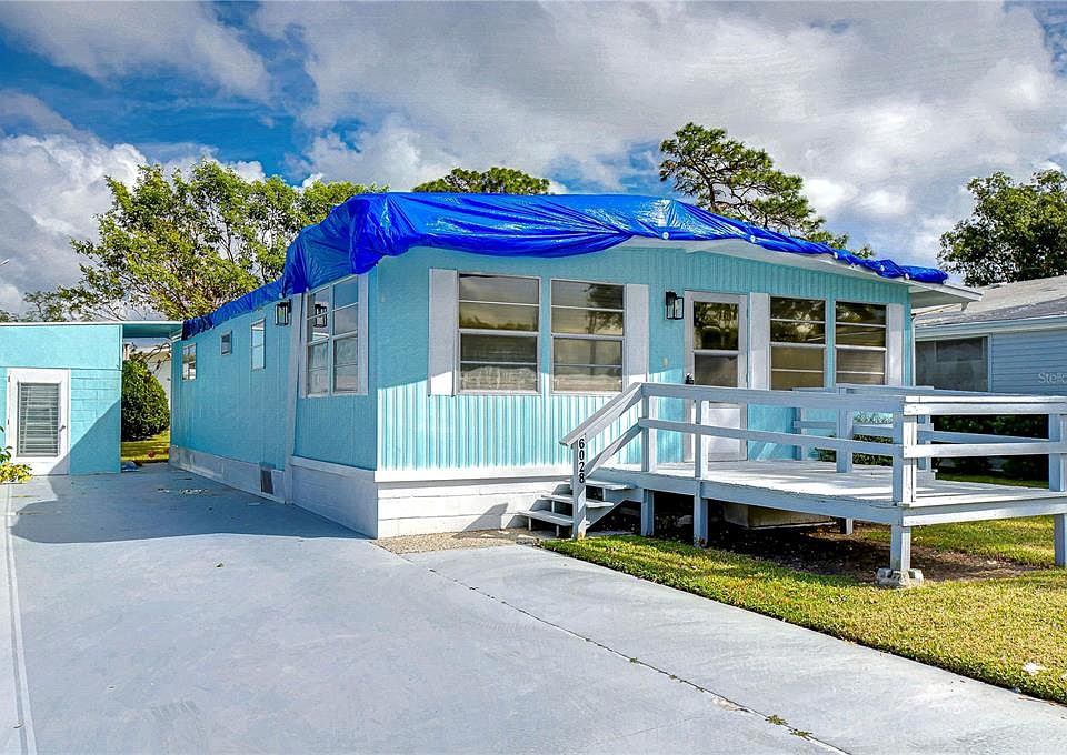 Charming 1968 Double-Wide Mobile Home with Endless Potential! This is a handyman's dream, Step into this spacious, vintage double-wide mobile home, brimming with character and an inviting open floor plan perfect for relaxed living. Featuring 2 comfortable bedrooms and offered fully furnished, this home is an ideal blank canvas for those seeking a cozy retreat. While it sustained some damage during Hurricane Milton, with a roof and carport needing replacement, the sturdy bones and unique layout make it worth the investment. Outside, a concrete storage building offers ample space for your laundry appliances, gardening tools, and more. With a few repairs and a touch of creativity, this gem could easily transform into a charming retirement haven or a warm winter getaway. Embrace the opportunity to bring your vision to life in this home that’s just waiting to shine again!