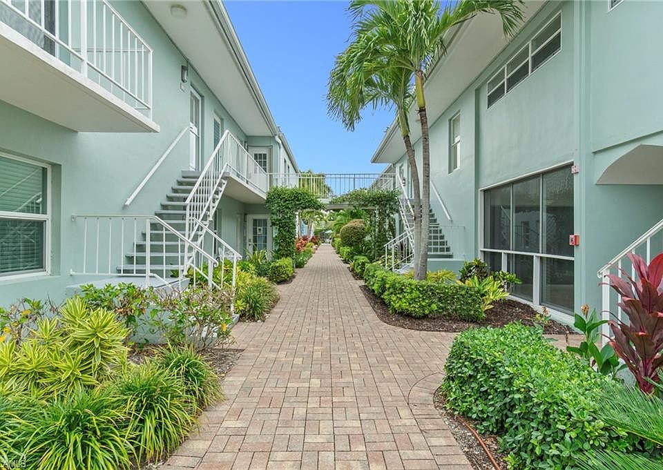 SEASONAL RENTAL DOWNTOWN NAPLES! This completely renovated first-floor condo is located Everglades Club at Village Green, a 55+ community just steps to the beach, Naples Pier, and all the dining and shopping of Third Street South and Fifth Avenue. No room was untouched this home features recessed lighting, new furniture, and a modern coastal design throughout. The open floor plan flows with polished tile, a bright kitchen, and spa-inspired bathrooms with walk-in showers. One bedroom offers private outdoor access, while the other provides comfort and style. Additional updates include a 2023 water heater and impact-resistant windows and doors. Enjoy peaceful courtyard and park-like views from your private patio. For added convenience a designated parking spot and bonus storage locker. Village Green residents benefit from a community pool, clubhouse, bocce and shuffleboard courts, library, game room, and workshop all in the heart of Olde Naples.