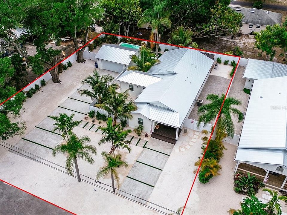 Welcome to your modern yet timeless haven! Nestled in a serene setting on an oversized double lot, this charming pool home + 2 car detached garage, has been meticulously renovated to offer you the ultimate retreat. Every detail has been carefully considered, from the organic, light-filled ambiance to the modern amenities that enhance your comfort and convenience. Upgrades include all new electrical, plumbing, Impact windows, Foam insulation, metal roof, A/C and Water Heater. Upgraded with all the modern amenities you could desire, this property is a testament to luxury living. Step inside and be captivated by the seamless blend of elegance and functionality. Porcelain tile floors lead you through the open-concept living area, where high ceilings and contemporary lighting create an inviting atmosphere. The fully equipped kitchen, adorned with LG/Whirlpool appliances, soft close cabinetry, a beautiful custom terraneo hood, and Quartz countertops, is the perfect spot for entertaining family and friends. But the true entertainers delight lies outside from the living area to the private courtyard then leading into the backyard paradise. Fully fenced and designed for relaxation and entertainment, the outdoor space features an elevated pool/spa combo with LED lighting, Artificial turf with paver walkways, a three-hole putting green, Pavilion W/ electric and grill and beautiful tropical landscaping with irrigation. This 11,760 sqft property offers plenty of room for your Boat, RV, or another storage unit which can be tucked away behind the fence for full privacy. Conveniently located just 8 miles from Anna Maria Island, 2 Miles to Downtown Bradenton and within reach of nature trails, kayak launches, grocery stores, restaurants, and shops, this timeless bungalow offers the best of both worlds: tranquility and accessibility. No Deed or Rental Restrictions. Perfect for a full time or second home and Investment property! Don't miss your chance to make this stunning, newly remodeled home your own. Furniture package available for purchase. Projected Revenue also available upon request. Schedule a viewing today and prepare to fall in love!