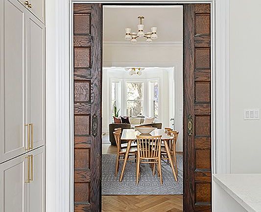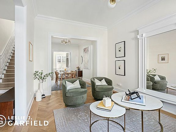 A stoop entry leads past a beautiful limestone facade to an open, sun-filled parlor floor with soaring 10’ ceilings, expertly preserved period details including original wood banister and pocket doors, and herringbone white oak floors. The luxurious chef’s kitchen features expansive custom cabinetry, quartz countertops, and a large island with a farmhouse sink. The appliances are top-of-the-line, including a paneled Sub-Zero refrigerator, a Viking six-burner stove, and a Miele dishwasher. Just past the kitchen, the rear extension includes a bonus breakfast nook and powder room, as well a second staircase that allows for easy access to the finished lower level and also opens to the rear bluestone paved garden - perfect for entertaining all year around.