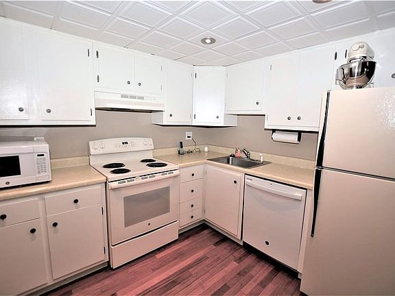 Cute and Cozy one bedroom, garden apartment. Despite its relative size, there is a lot of space here. A small eat-in kitchen, a formal dining and living room leading to a small patio. A nice size master bedroom with large closet and a conveniently located main bath. Laminate in kitchen and carpet throughout rest of living space. A coin operated laundry room just down the hall and a drive through integral garage with assigned space. There is a new installed saltwater swimming pool, tennis courts, party room which is part of the HOA fee that also includes water, sewage, trash, landscaping and snow removal. A very easy to maintain condo designed for carefree living!