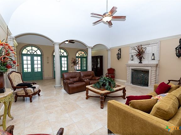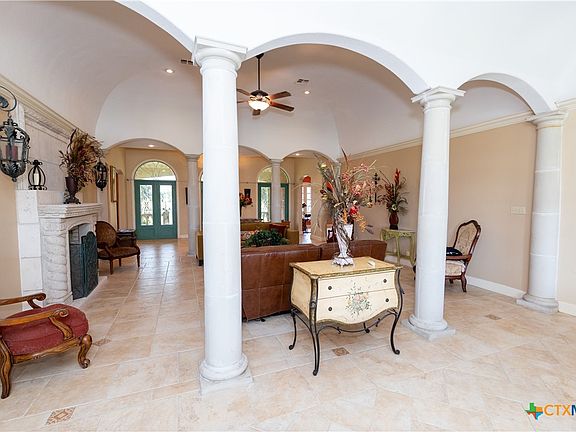 Discover the epitome of country luxury with this Mediterranean-style horse property in Lavaca County. Spanning over 12 acres, the estate blends expansive outdoor living with refined indoor elegance, centered around a home that exudes fine living at every detail. This Luxurious Mediterranean residence with decorative metal doors opening to a dramatic great room. The kitchen is equipped with built-in China cabinets, pantry, granite countertops, apron sink, and premium appliances including a Viking gas range and Sub-Zero refrigerator. A formal dining room, adjoining living room with a wood-burning fireplace, and an inviting office. Primary suite designed for comfort and privacy, featuring a generous seating area, direct outdoor access, a double vanity bathroom, oversized shower, laundry space, and his/her walk-in closets with separate toilet rooms, and laundry hookups. Six bedrooms and three baths plus utility space and extra rooms; an additional multipurpose room offers flexible living options. Ornate metal railing along the stairs and foyer balcony, adding a touch of artistry. Outdoor oasis: inviting backyard, covered back porch, pavilion, and a detached studio ready for use as a workshop, studio, or guest space. Barns on the property support livestock and storage, with oak trees providing classic Texas charm and shade. This home is designed for those who crave space, quality finishes, and the lifestyle of a rural retreat without sacrificing modern comforts. With abundant room for horses and activities, you’ll never want to leave this turnkey property.