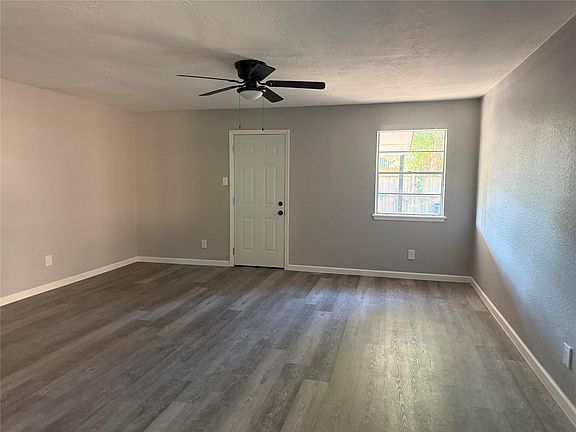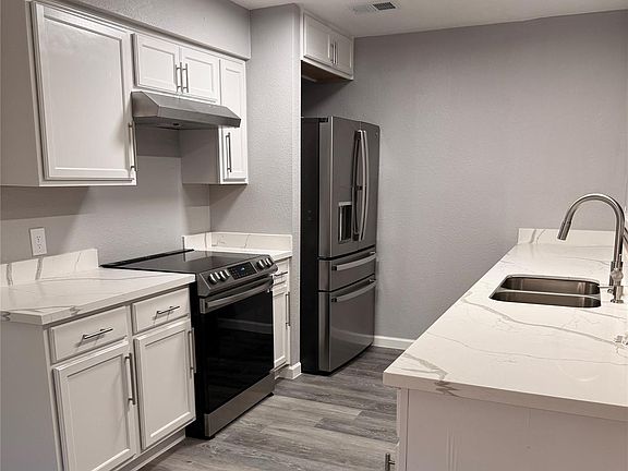 Completely renovated all-brick home featuring three bedrooms, two full bathrooms, and a two-car garage. The interior includes new luxury vinyl plank flooring throughout, fresh paint, and updated lighting fixtures. The kitchen offers new cabinetry, quartz countertops, and stainless-steel appliances. Bathrooms feature modern vanities, matte black fixtures, and marble-look tile surrounds. Spacious living area with ceiling fan and natural light. Exterior features mature trees, a fenced backyard, and a double driveway providing ample parking
