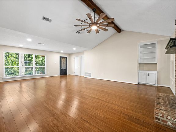 Welcome to this renovated beauty in Elkins Lake! This 2039 sq ft home offers 3 bedrooms, 2 full baths, kitchen with double ovens, wood flooring, and a luxurious master bath with custom vanity. Updates include a new roof, granite countertops, and newer appliances. Enjoy the community amenities like golf courses, swimming pools, tennis courts, walking trails, and more. The property features a brick exterior, spacious living room with wood-burning fireplace, formal dining area, a large yard, and a patio for outdoor relaxation.