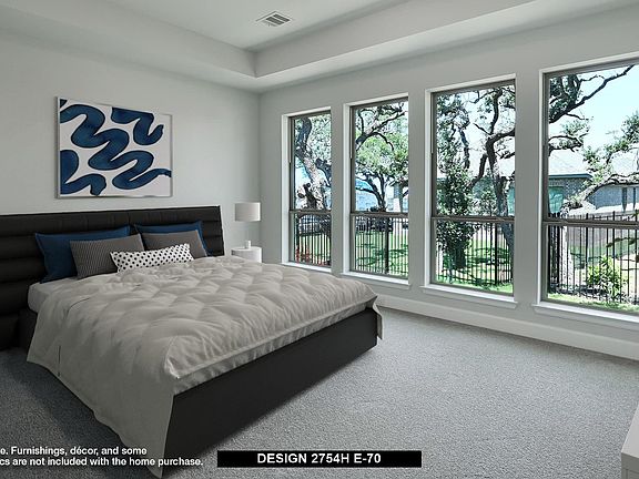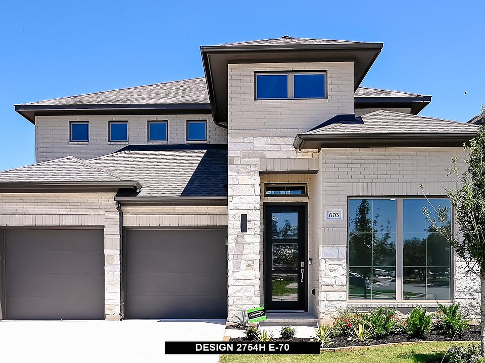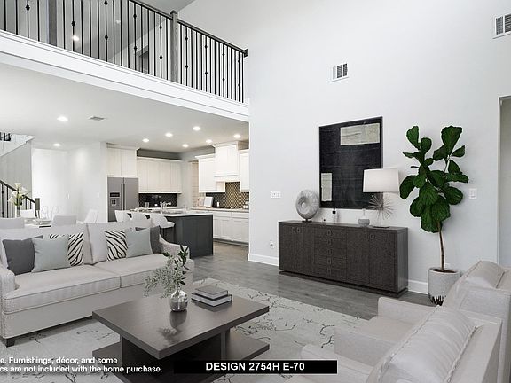 Two-story entry framed by home office with French doors. Two-story family room with 19-foot ceiling flows into the kitchen and dining area. Island kitchen with built-in seating space and corner walk-in pantry. Secluded primary suite features a grand wall of windows. Primary bath offers a French door entry, dual vanities, garden tub, separate glass enclosed shower and two walk-in closets. Additional bedroom just off the kitchen area. Second level hosts bedrooms, and a large game room. Utility room. Covered backyard patio. Mud room just off the two-car garage.