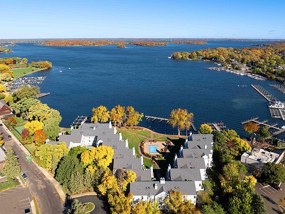 Experience effortless lake living! Elegant end unit condo at the Excelsior Bay Gables featuring unobstructed panoramic views of Lake Minnetonka's Excelsior Bay and Big Island. The primary suite and second bedroom bookend this naturally sun-filled 1,483-sq-ft layout. A beautifully updated kitchen flows into the dining and living room, while a covered wrap-around maintenance free balcony takes full advantage of the lake views and surrounding natural beauty. The bonus room across the hall can be used as an office or additional storage. HOA amenities include a heated swimming pool, tennis courts, year-round hot tub and sauna facilities, a well-equipped fitness center, private docks with boat slip rentals available, meticulously maintained outdoor common areas, and secure underground heated garage parking with two designated spaces. Enjoy the convenience of walkable access to Downtown Excelsior's charming shops, fine restaurants, and Commons Park, all while embracing the relaxed luxury of waterfront living in one of the area's most desirable locations.